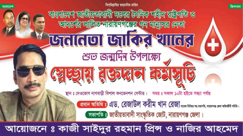 নারায়ণগঞ্জ জেলা ছাত্রদলের সাবেক সভাপতি ও মহানগর বিএনপি নেতা জাকির খানের জন্মদিন উপলক্ষ্যে স্বেচ্ছায়ে রক্তদান কর্মসূচি অনুষ্ঠিত হবে।